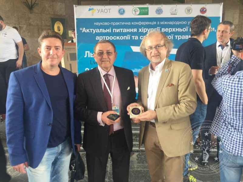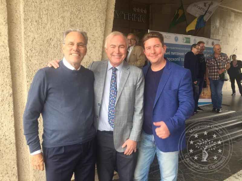Продовження конференціі з нашими друзями-гостями: головним спортивним травматологом Європи Matteo Denti, Milan Italy (зліва), та головним ортопедом травматологом світу Philipe Neyret Lyon France (поцентру)